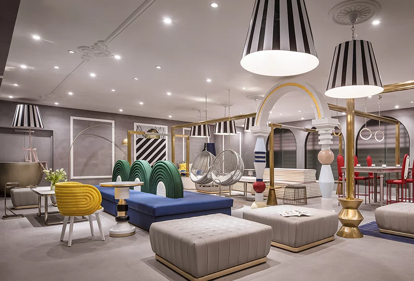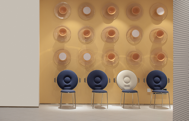 二樓,2樓,作為用餐空間。重點放在走廊末端區域的設計上,使用彩色背景墻以及與餐廳相關的有趣家具和裝置。