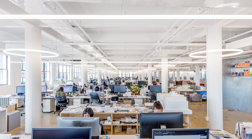 由于振興后的工業(yè)區(qū)位于紐約東河沿岸,開放式辦公室裝修的連續(xù)玻璃窗提供了毗鄰曼哈頓天際線的全景。這間辦公室是由BIG的內(nèi)部團(tuán)隊(duì)設(shè)計(jì)和規(guī)劃的,其特點(diǎn)是重復(fù)的元素,為整個(gè)開闊的空間提供了連貫的連續(xù)性。