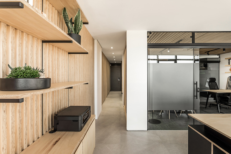 設計師為該辦公室選擇的材料,力求突出客戶的產品,展示其在室內建筑(家具、裝飾板)中的質量制造和靈活性。