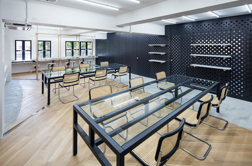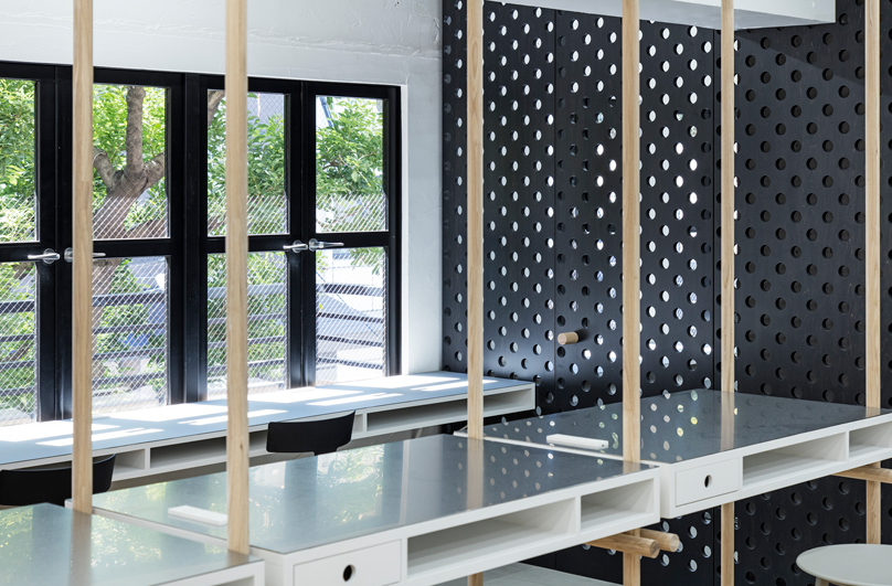 辦公室細節設計中使用的穿孔材料是公司自身產品制成的。這些穿孔,也用于E&Y生產的家具,在空間尺度上表達了企業的身份。該材料還用于傳輸空氣和光,減輕了行政室和會議室的限制條件。這些孔足夠大,可以插入用作門把手和擱板定位銷的木棍。員工可以在任何方便的位置輕松安排貨架。