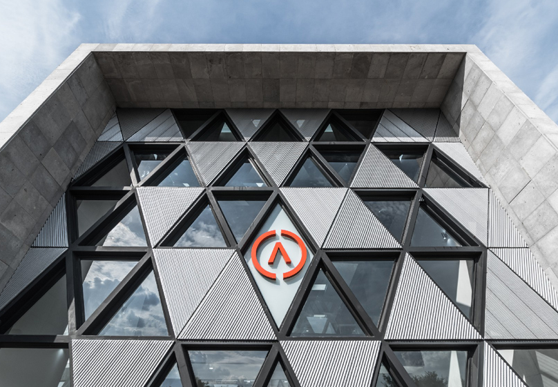 為了與綠樹成蔭的溪流建立聯系,從公司的大堂就營造了視覺效果。同時,延伸到建筑外部的外部露臺。外主立面設計為三角形圖案,以公司的企業形象為參照,具有象征性和獨特性,圖案的基本模塊對應于組織標識的同型,該標識包含在立面的中心部分。