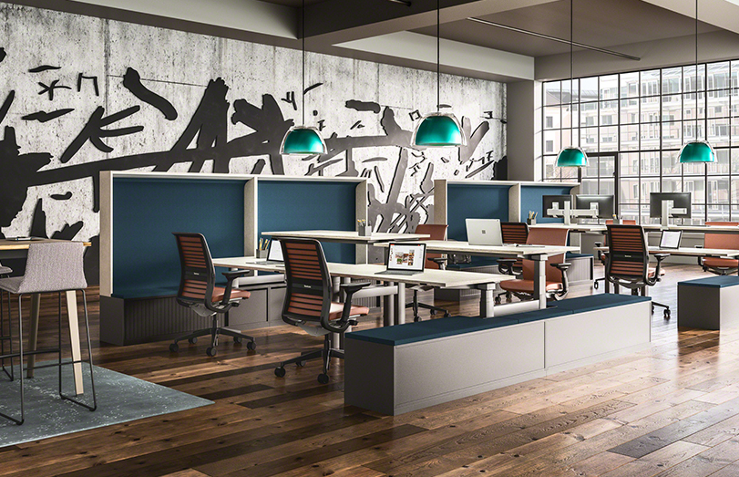由于Steelcase尋求在開放空間和個人辦公室之間找到一個折衷方案,所以在他們在辦公室裝修中除了工作站之外,該公司還提出了協作要素。為了支持團隊合作和工作場所內的共享,這些元素允許為演示和會議以及接觸設置一個開放的布局空間。