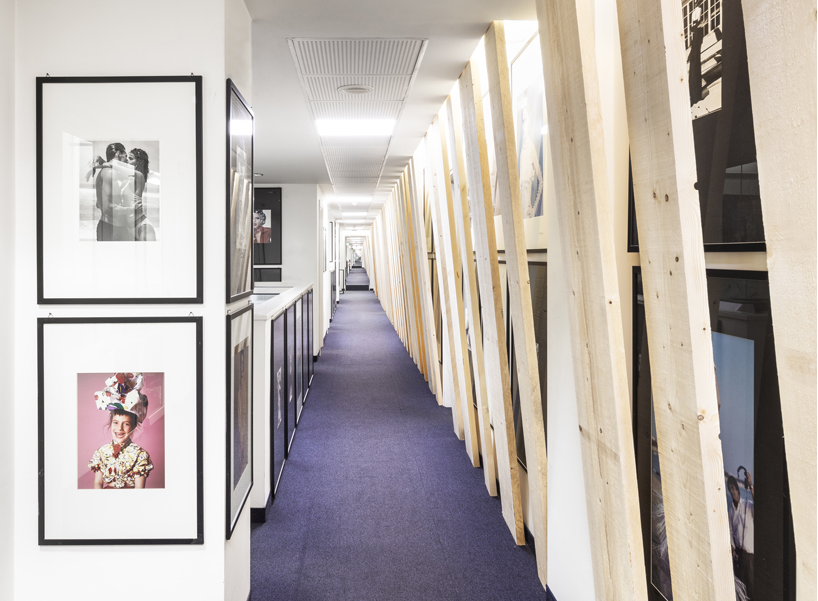 下面一個(gè)辦公室裝修是由,一長(zhǎng)串樹(shù)脂木板以不均勻的間隔排列,它們靠在墻上,沿著過(guò)道延伸,就像人類的脊柱一樣,連接著一切。而這種辦公室裝修的一條狹長(zhǎng)隧道,其中一面充滿了時(shí)尚歷史的圖像,被強(qiáng)烈的照亮。