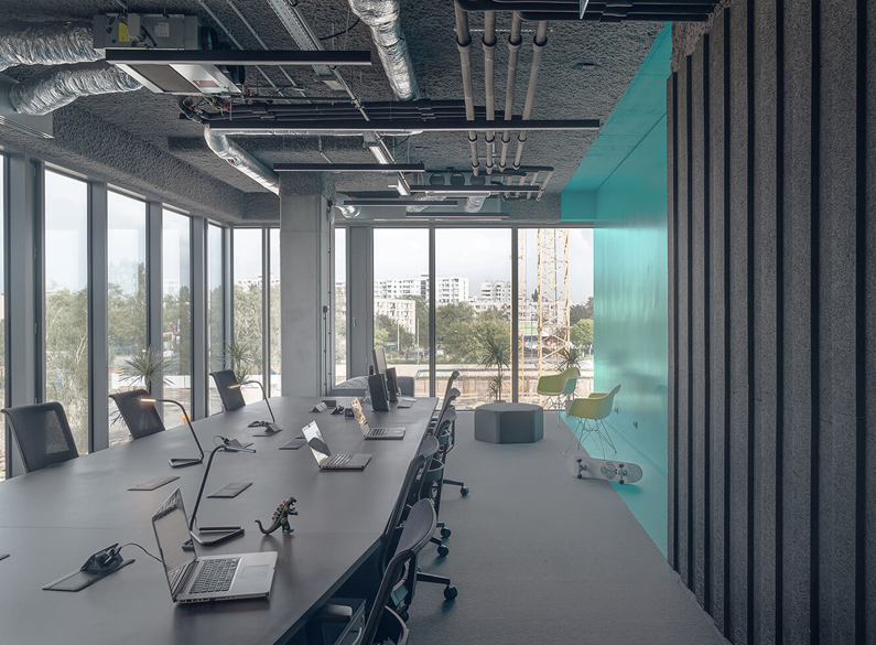 辦公室裝修采用的噴霧泡沫天花板和聲學(xué)面板墻被用來減輕聲音的傳輸和保持聲學(xué)的舒適性。而不是解決這與一般的聲學(xué)天花板瓷磚或擋板,聲學(xué)處理被整合為空間室內(nèi)設(shè)計(jì)的一部分。辦公室裝修的隔音墻板采用條紋浮雕圖案,為內(nèi)墻飾面提供尺度和節(jié)奏感,而辦公室裝修的天花板則采用整體方式,在某些情況下覆蓋所有機(jī)械設(shè)備,將它們變成懸掛的抽象物體,通常會被通用下降的天花板系統(tǒng)所掩蓋。