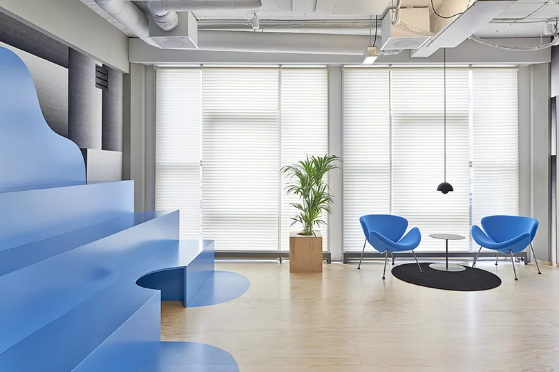 另外辦公室裝修中定制的印花地毯,固定在墻上的矩形漸變,反映了設(shè)計師對當(dāng)代城市景觀天際線的詮釋。辦公室裝修所定制家具與現(xiàn)有家具相結(jié)合,營造出私密的空間,強(qiáng)調(diào)彩色雕塑與天然植物的有機(jī)結(jié)合。