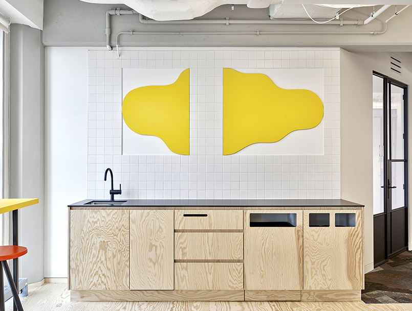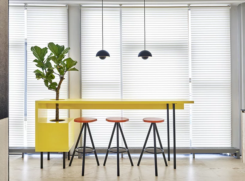 辦公室裝修中設(shè)計的操作臺上面也有黃色的裝飾,雖然簡單,但讓空間也有趣起來。