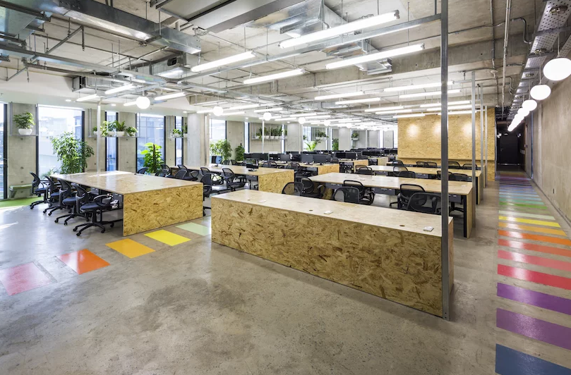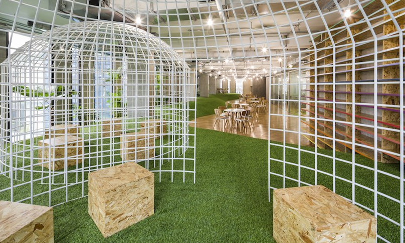與暴露在外的混凝土地板形成鮮明對(duì)比的是,公司的標(biāo)志采用了多色條紋,展示了一個(gè)由一群五顏六色的人建造的地球儀。在其他地方的辦公室裝修設(shè)計(jì)中,類似鳥籠的結(jié)構(gòu)提供了非公開會(huì)議室的替代方案,并且可以移動(dòng)以適應(yīng)各種情況。