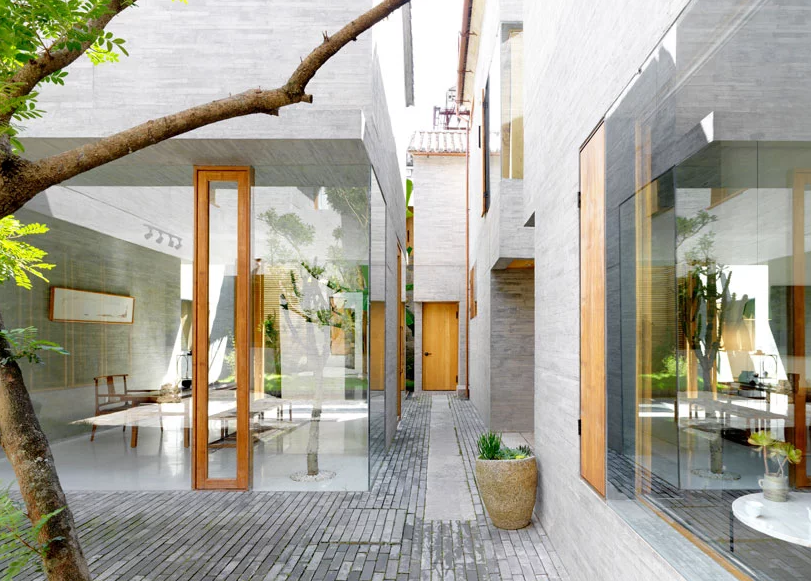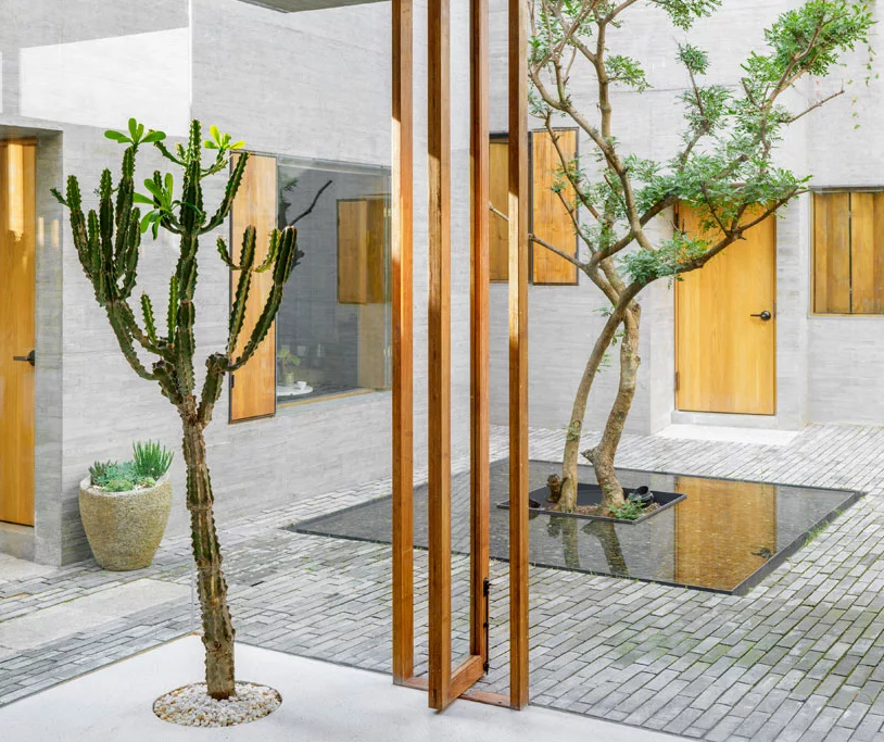 庭院經(jīng)常有一天中某些時(shí)間太暗的缺陷; 然而,sunyata酒店沒有這個(gè)問題。朝陽(yáng)建筑師設(shè)計(jì)了一個(gè)允許光線和視覺透明度的方案,使庭院成為一個(gè)開放的空間,光線投射到各個(gè)角落,陰影和陽(yáng)光混合在一個(gè)舒緩的陰陽(yáng)之中。玻璃飛機(jī)是如此專業(yè)地安裝,即使是人類也會(huì)懷疑它們的存在/知道空間的起點(diǎn)和終點(diǎn)。